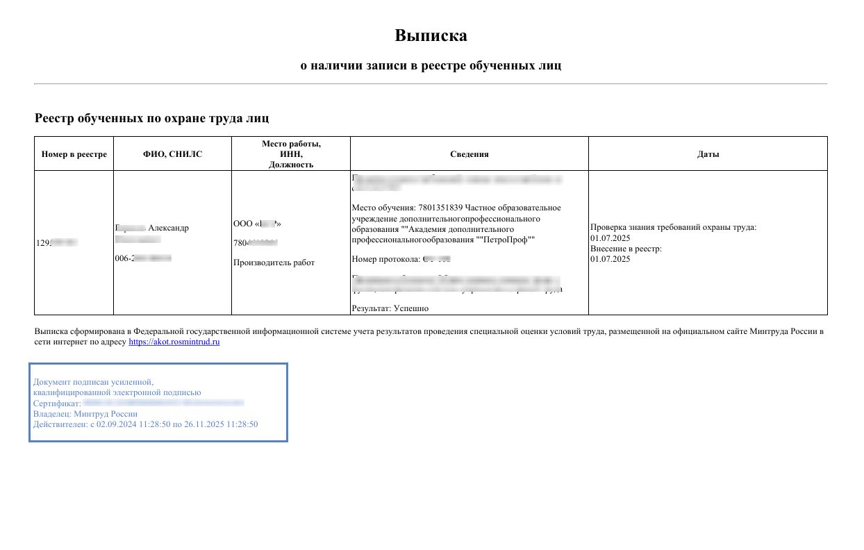 По результатам аттестации выпускник получает диплом установленного образца, который подтверждает его квалификацию и право занимать должности, связанные с охраной труда. После завершения обучения специалист может организовывать и контролировать систему безопасности в компании, а также проводить внутреннее обучение сотрудников. Программа направлена не только на получение знаний, но и на формирование готовности к практическому применению решений в разных производственных условиях, а также на повышение знаний в области охраны труда